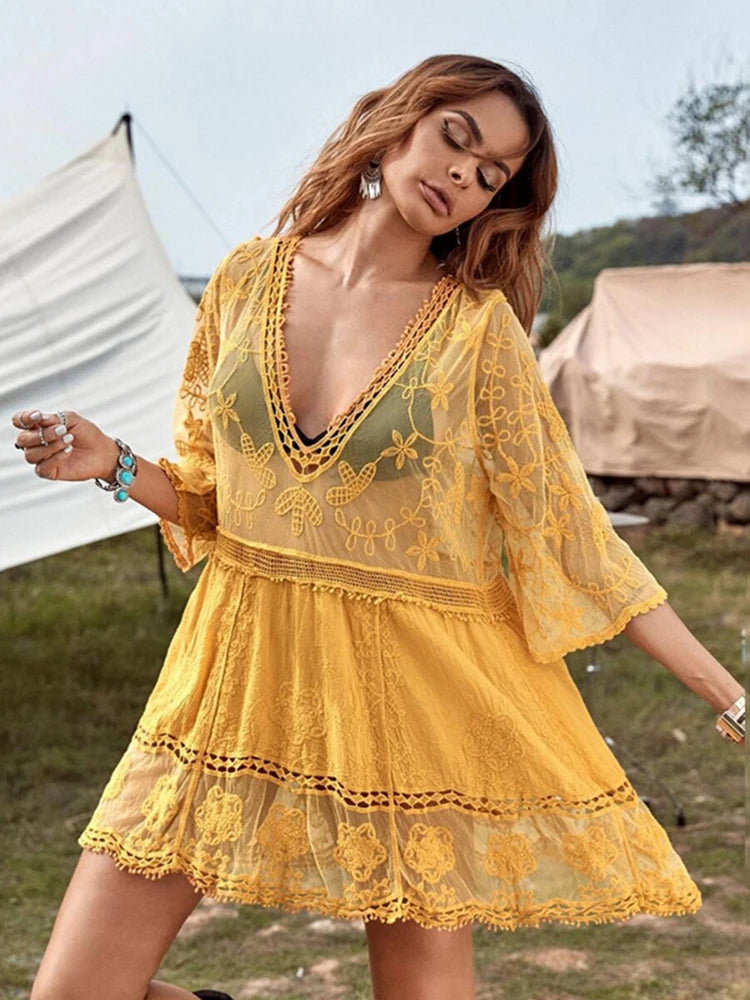 Vestido Blanco de Encaje Bordado: La elegancia se encuentra con la sensualidad en este vestido único. Su diseño backless y su profundo escote en V te harán sentir radiante, ya sea disfrutando de un día en la playa o bailando en una noche de celebración.